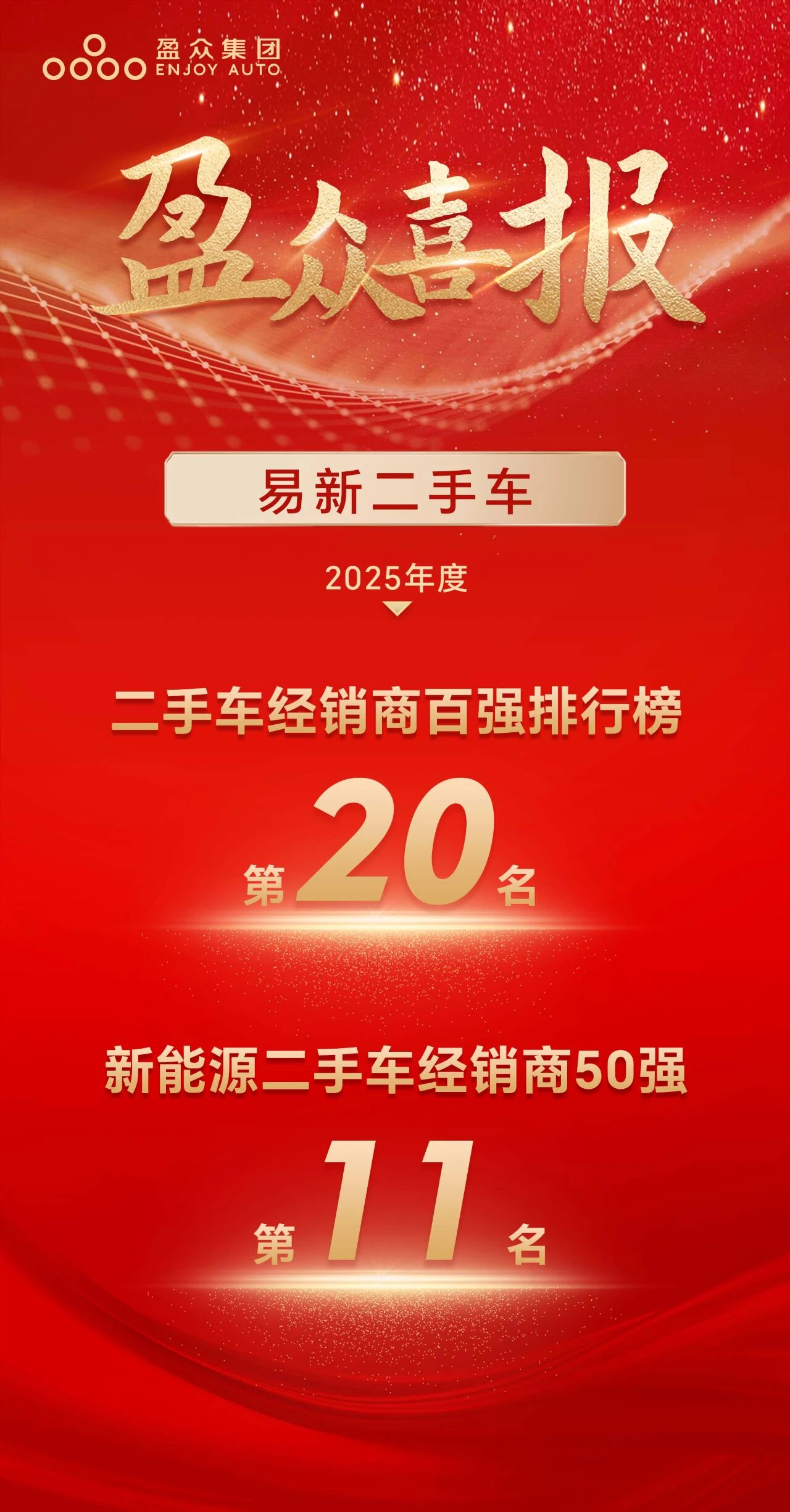 易新二手車入圍“2025年度中國汽車流通行業(yè)二手車經(jīng)銷商百強(qiáng)排行榜”,位列全國第20名。